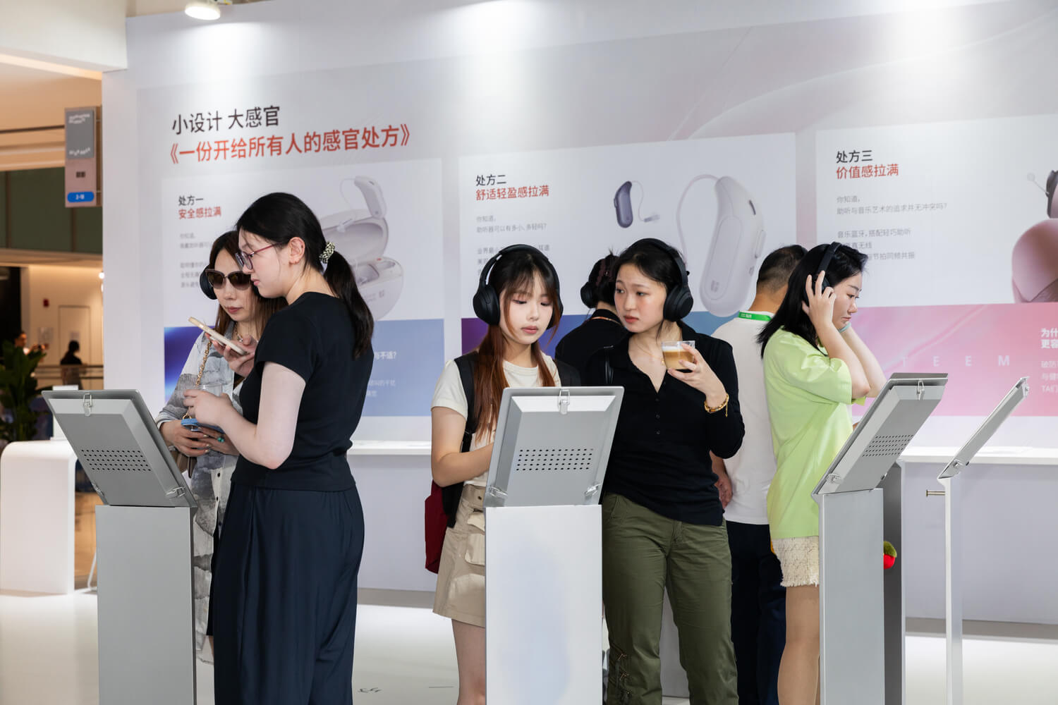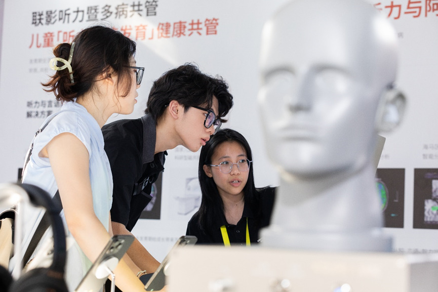年轻人沉浸式体验了「1分钟与听障人士交换人生」交互装置,感受听损人士的世界,直观认知听力损伤对不同人群造成的生活不便和危害,提高对听力健康的认知与重视。