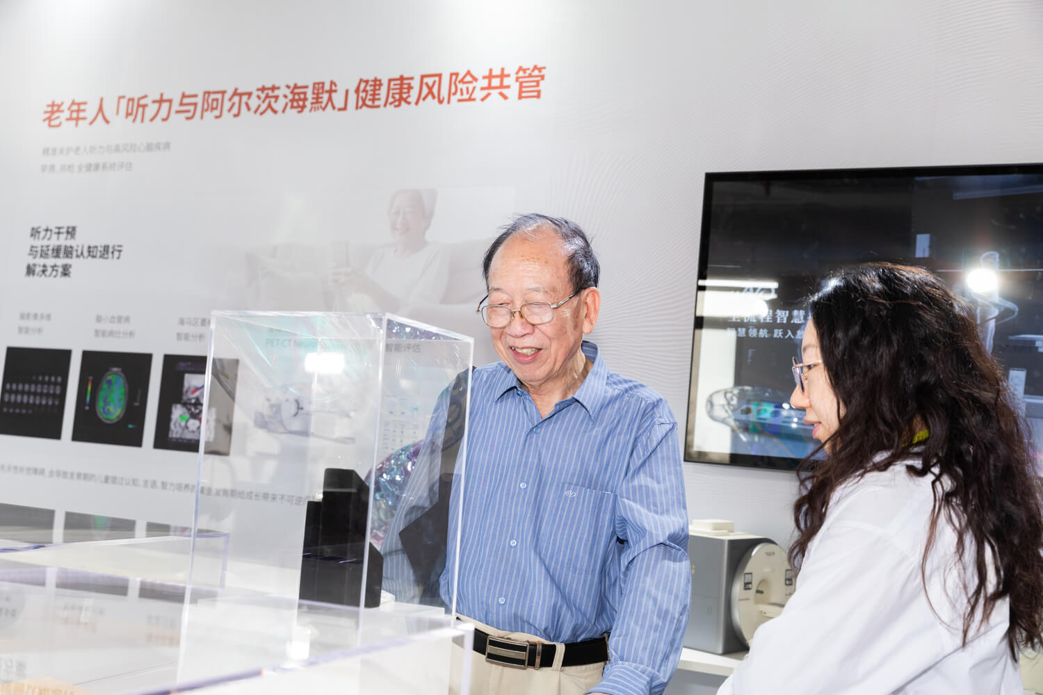 展会现场,联影助听器的展台吸引了众多观众的驻足。老一代科技工作者深度了解联影助听器的医疗级核心功能、先进的智能算法和医疗级的验配测听服务,热烈赞赏中国「智」造的前沿发展。